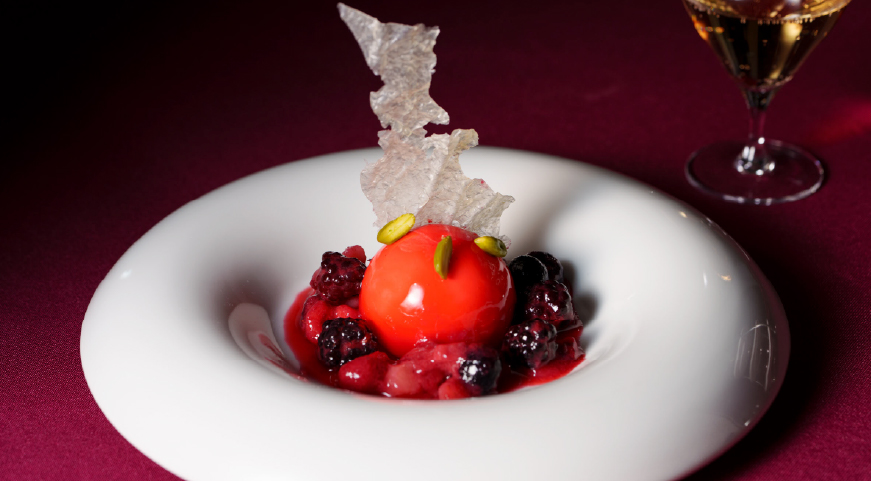 ・洋なしとピスタチオのムースとミックスベリーのソース